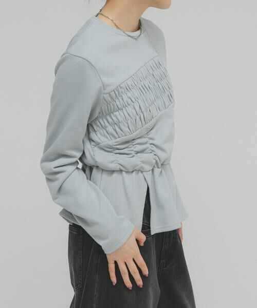 程よい厚みのミニ裏毛素材を使用したプルオーバー。身頃のランダムシャーリングデザインがポイントになっており、自然と着映えます。ウエスト部分にゴムを入れ、ペプラムディテールを取り入れました。コンパクトなサイジングなので、ボリュームのあるボトムと相性抜群です。