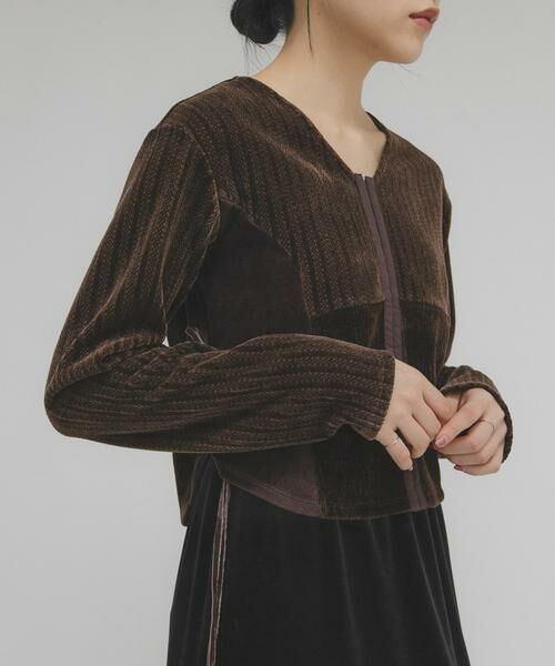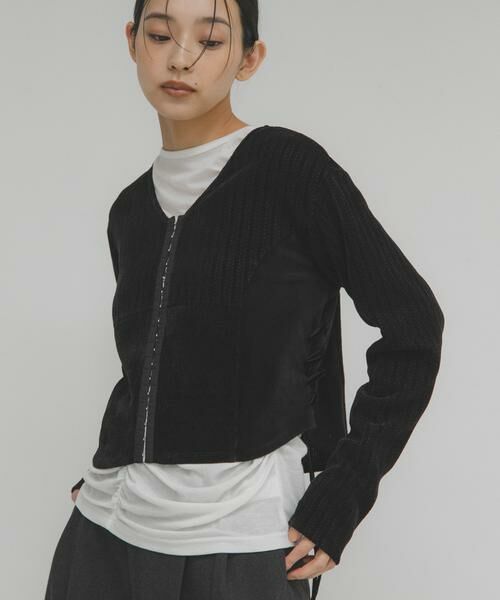 3種類のジャガードベロアカットソーを使用したコンパクトなカーディガン。それぞれ異なる表面感がキャッチーな印象にしてくれます。サイドのドロストを調整すると、少しラウンドした裾になるところもポイント。インナーにタートルネックを入れた着こなしも可愛いです。