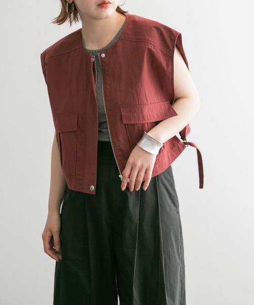 大きめのポケットが印象的なコンパクトベスト。アームホールがなく裾まで開いたデザインになっており、裾はドロスト仕様なのでサイズ調整が可能です。スポーティーさを演出するパリッとした素材も特徴的。レイヤードスタイルに万能な1着です。
