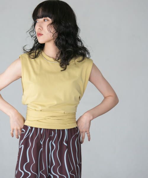 ベーシックなノースリーブトップスに見えますが、ウエストに共ひもが付いている1着。ひもをウエストにぐるっと結んでいただくだけですっきりとした着こなしに仕上がります。着心地の良い綿100%素材も嬉しいポイント。落ち着いた印象のNAVY、顔周りが華やかになるPINK&YELLOWをご用意しました。