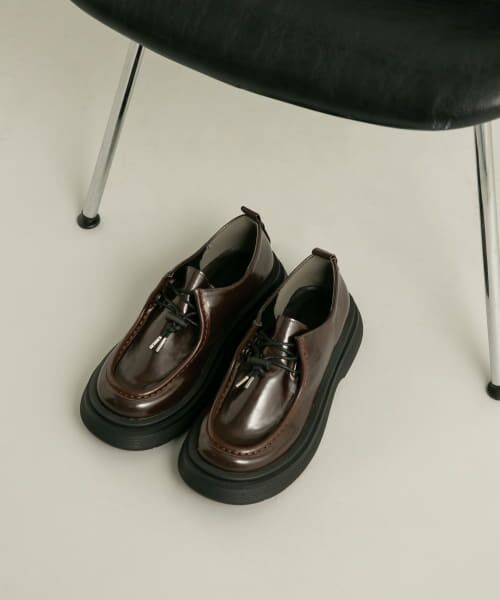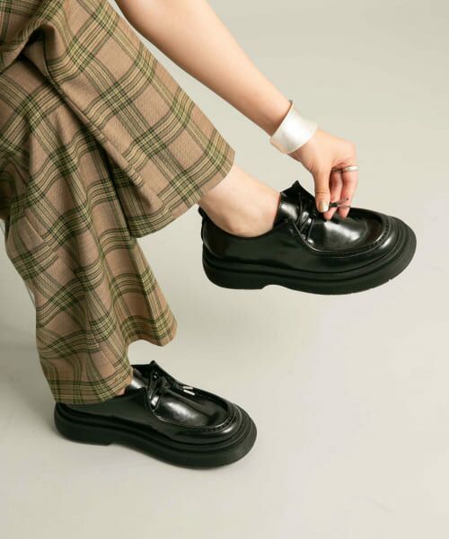 しっかりホールド感があり歩きやすい、パイピングデザインが目を惹くローファー。程良く厚みがあり、ブーツの底を使用しているので裾の長いボトムと相性抜群。ソックスを合わせたカジュアルスタイルや、パンツでマニッシュにまとめたり様々なスタイルにマッチします。