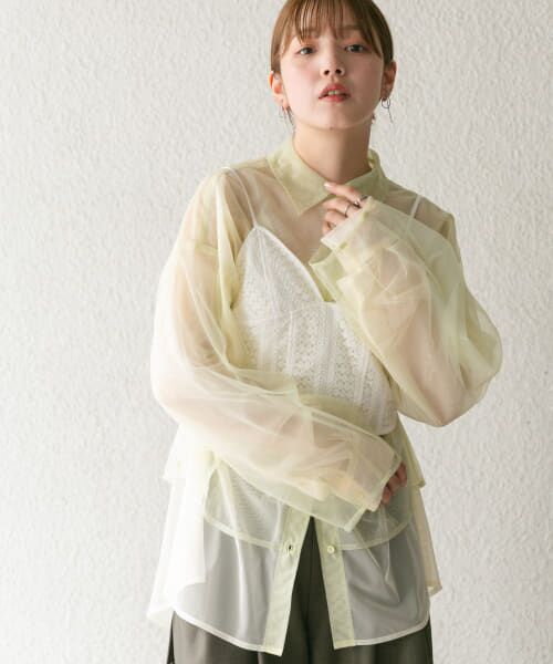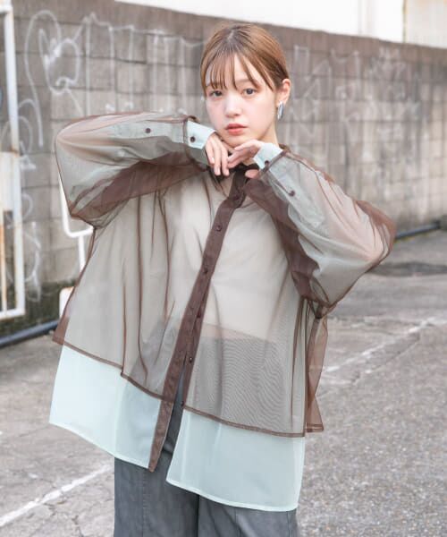 配色のチュール素材を2枚に重ねた、モードな印象を放つレイヤードシャツ。程良い透け感がこなれ感を演出します。下側は少しハリがあり、上側は柔らかい素材を使用することで自然と動きがでる仕上がりにしました。1枚で華やかさがあるのでシンプルなボトムと相性抜群です。