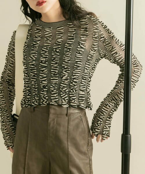 シャーリングディテールのくしゅくしゅ感が可愛い着映えトップス。インパクトのある柄ながらも程良い透け感があり、ランダムな凹凸仕様が軽やかな印象にしてくれます。コンパクトな着丈はメインのみならず、インナー使いにもおすすめです。