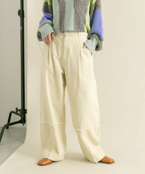 フリンジディテールがポイントの、ストレートシルエットパンツ。フリンジ位置にこだわりつつ、表面感のある生地に加工を施すことでヴィンテージライクな風合いに仕上げました。同素材のフリンジカーブヘムジャケット( KB46-27F11)もございます。