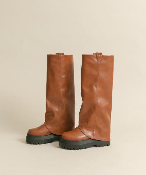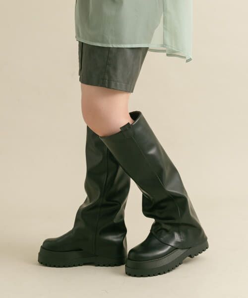 ブーツカバーのように被さったデザインが特徴的なロングブーツ。カバー部分は若干くしゅっとなるような生地にし、トレンドの厚底でボリュームを出しました。大きめの筒周りと、ファスナーが内側に付いているので着脱しやすいところも嬉しいポイント。いつもの着こなしにプラスするだけでエッジの効いたスタイルが叶う1足です。