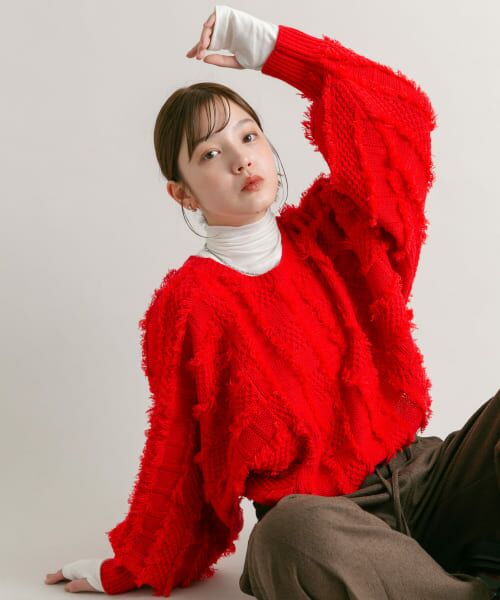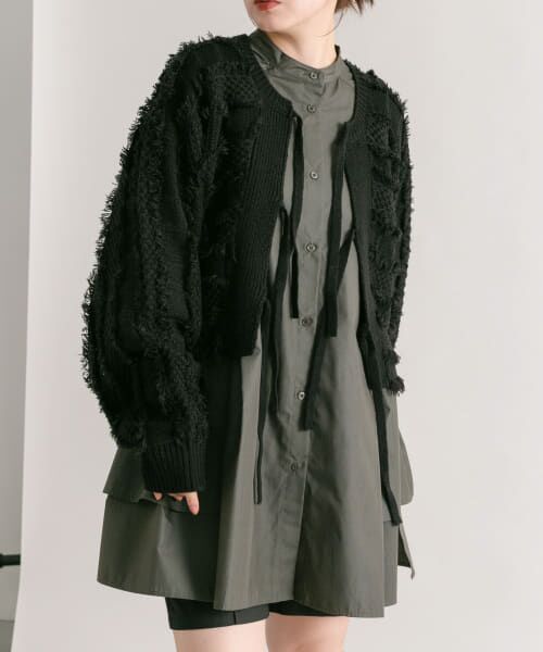 表面にランダムなフリンジが出るよう、こだわった編地が特徴的なニットカーディガン。前後2WAYで着ていただくことができ、その日の気分で表情の変化を楽しめます。二の腕をカバーしてくれるゆるっとした袖のボリュームと、リボンディテールの絶妙なバランスが◎プルオーバーとしても活躍するのでワードローブにあるとおすすめです。