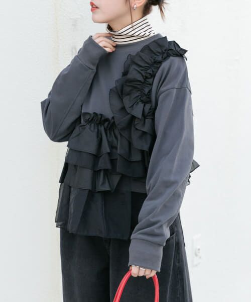ショート丈のベーシックなスウェットに、透け感のないフリルとオーガンジー素材をランダムにドッキングさせた着映えトップス。ウエストはペプラムデザインのように仕上げ、肩からのカーブラインもこだわりのポイントです。また、アウターが羽織りやすいよう袖をシンプルにしました。カジュアルと女性らしさを兼ね備えた1着です。