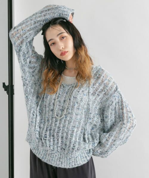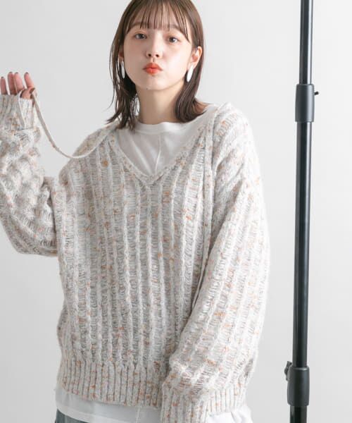 グラデーションカラー&少し大きめのカラーネップが特徴的な糸を使用したニット。前後2WAYの着用が可能でゆるっとしたルーズなシルエットもポイント。合わせるインナー次第でカジュアルにもフェミニンにも仕上がります。