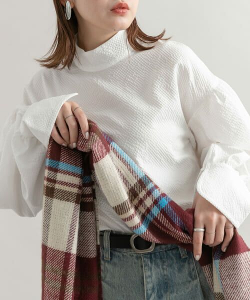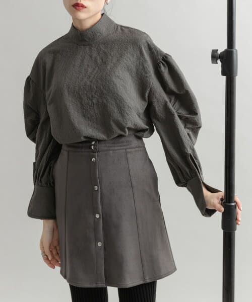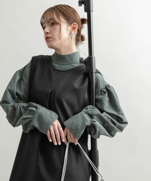 少し表面感のある生地を採用し、袖のギャザーでボリュームを演出したカーブスリーブが特徴的なブラウス。ハイネック仕様や、両脇裾に入った深めのスリットもポイントです。身頃はすっきりとしているので、メイン使いのみならずジャンパースカートにもレイヤードしやすいです。
