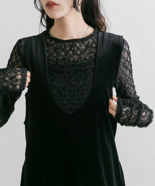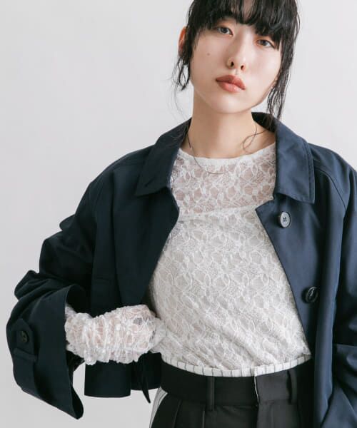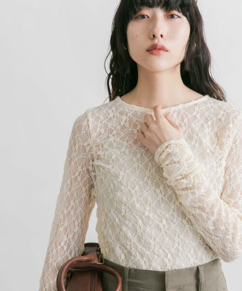 少しポコポコ感のある、ヴィンテージライクなレース生地を使用したトップス。トレンドのドレープを身頃に施すことで、程良いフィット感がありながらもドレープが動きのある印象にしてくれます。袖口に入ったシャーリング仕様もポイントです。メイン使いのみならず、レイヤードアイテムとしても活躍します。