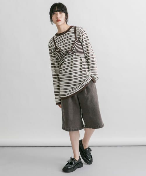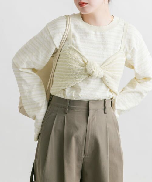 異なるボーダーピッチが特徴的なセットアイテム。少し丈が長めのトップスと、リボンのようなデザインのキャミビスチェを合わせました。さらっとドライタッチな質感や身体のラインを拾い過ぎないサイジングもポイント。カジュアルな中に程良い甘さを取り入れた1着です。