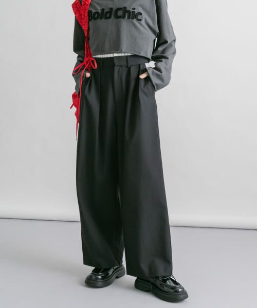 【ウエスト周りの異素材デザインが特徴的なスラックス】
