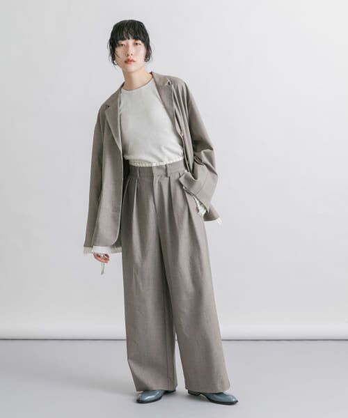 トップスをタックインし、ウエスト周りのデザインを活かしたスタイリングがイチオシです。同素材のレイヤードデザインジャケット(KBA4-27R030)とセットアップで着ていただくのもおすすめ。
