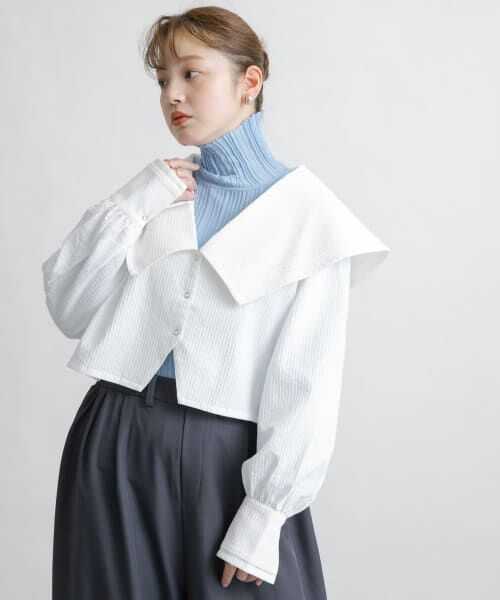 程良いハリのある素材を使用した、ビッグカラーが存在感を放つデザインブラウス。アウトスタイルでもバランス良く仕上がるショート丈と、ふわっとカフスに溜まるよう設定されたギャザーのディテールがポイント。クラシカルな雰囲気にしてくれる1着です。