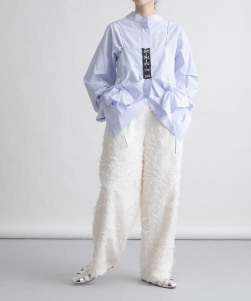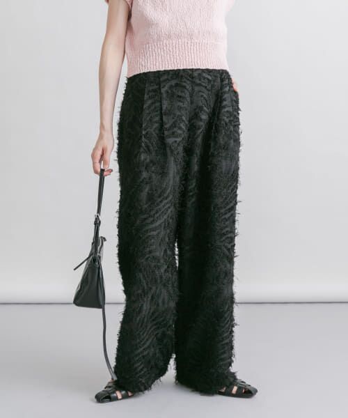 【表面感のあるフリンジが存在感を放つイージーパンツ】