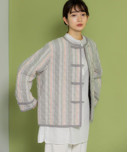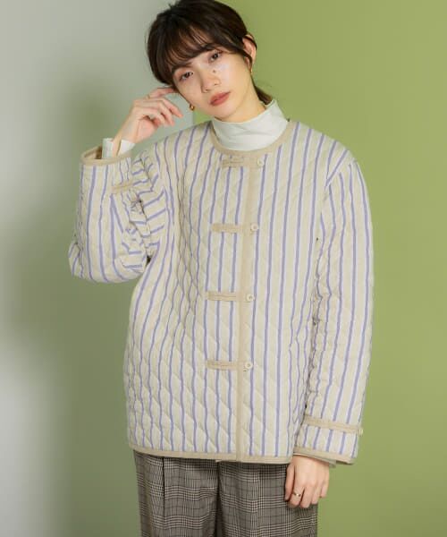 春らしい柔らかな色合いが魅力的なキルティングジャケットが登場。短すぎず長すぎない絶妙な着丈や軽い着心地、首元はノーカラー仕様ですっきりと着ていただけます。存在感抜群なストライプ柄はワードローブにあると◎