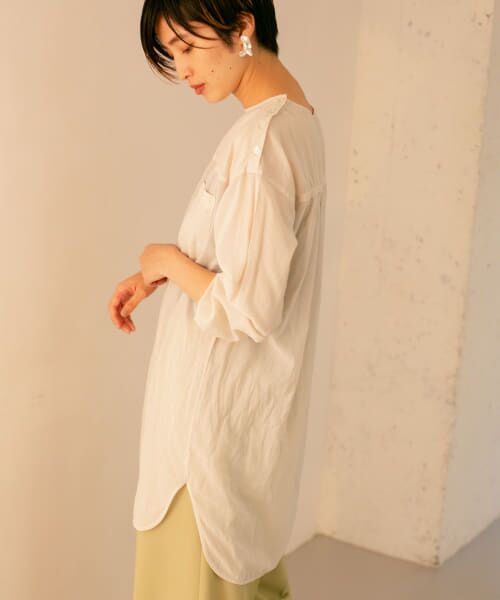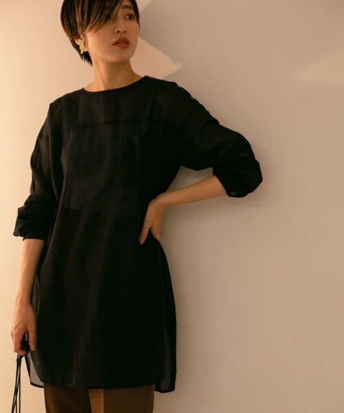 無駄なディテールを省いたシンプルなブラウスが登場。程良い透け感は女性らしさを演出してくれる。これからの季節に1枚で着て頂くのはもちろん、寒くなればニットやスウェットとのレイヤードも楽しめる着回し力の高いアイテムです。どんなボトムとも好相性で、ワンピースやサロペットのインナーとしても最適。雰囲気の異なるカラーバリエーションからお気に入りを見つけてみて。