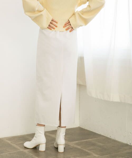 表面感のあるドライタッチなブークレ素材で作られたスカート。一見シンプルなIラインシルエットですが、サイドにパイピングを施すことでひと癖ある仕上がりになっています。ウエスト後ろがゴムになったラクな穿き心地にも注目です。