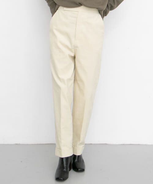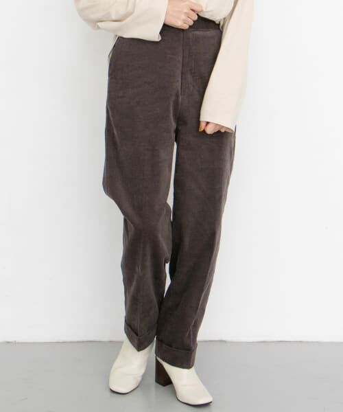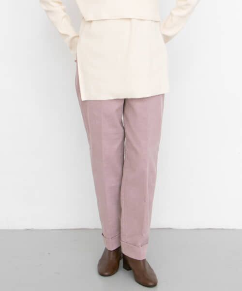 裾のロールアップが目を惹くコーデュロイパンツ。すっきりとしたウエスト周りやテーパードシルエットがカジュアルさを抑え、大人っぽい雰囲気を演出します。み合わせるトップスを選ばないのでワードローブにあると重宝すること間違いなし。足元はブーツやパンプスを合わせるのがおすすめですよ。