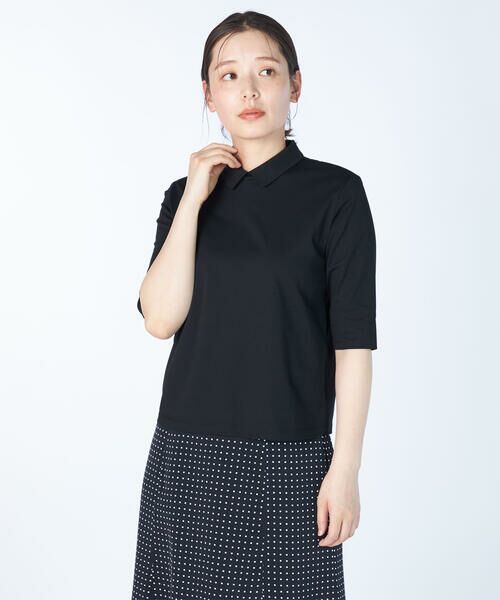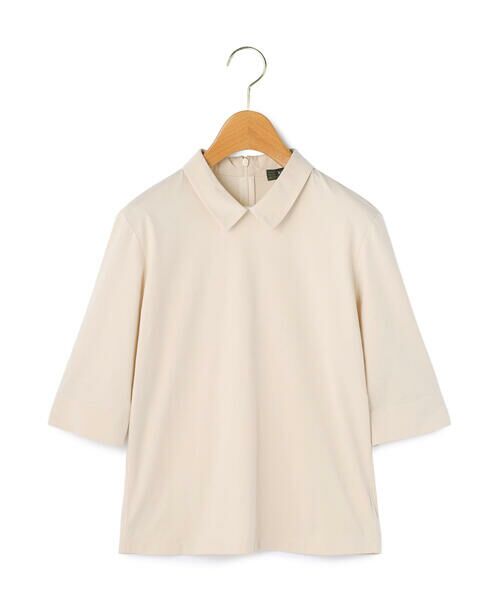 コットンをベースにポリエステルを織り交ぜた天竺素材のポロシャツ。襟付きながらもフロントボタンはなく、背面のジップで着脱する作りです。少し長めの袖が、ラフになりすぎないクラシカルな装いを後押し。膝下丈のスカートなどを合わせると、クリーンで好印象を誘うスタイリングをお楽しみいただけます。