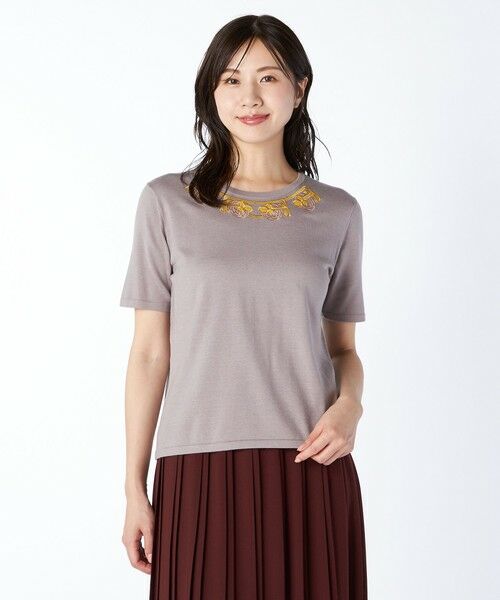 襟ぐりに華やかな刺繍、裾の裏面に配色をのせた半袖ハイゲージニットプルオーバー。シンプルなクルーネックタイプで、すっきり着こなせるコンパクトなシルエットです。カジュアルにもきれいめにもスタイリングでき、日常からお出かけまで幅広く活躍する一着。同生地のカーディガンとアンサンブルでも着用可能です。