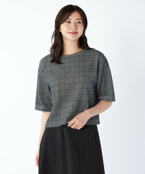 チェック柄のジャカードジャージー生地を使用したクルーネックカットソー。ソフトな風合いで、上品な印象ながらもリラックスして着こなせるアイテムです。ゆったりしたシルエットと短めの着丈のバランスは、コーディネートを旬な雰囲気に演出。パンツ、スカート問わず、様々なボトムと相性よく決まります。