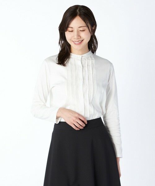 スカラップカットを施した異素材使いがポイントのブラウス。フロントに縦ラインの切り替えを取り入れたことで、スタイルがすっきりと見えるのも特徴です。トレンドのバンドカラーを採用。キレイ目感がありつつも印象が硬くなりすぎず、幅広いシーンで活用できるアイテムです。ちょっとしたお出かけにも適しています。※商品画像はサンプルを使用しているため、実際の商品と色味などの仕様が異なる場合がございます。予めご了承ください。model:T.172/B.83/W.59/H.87着用サイズ:38