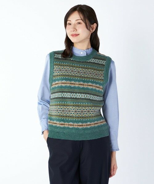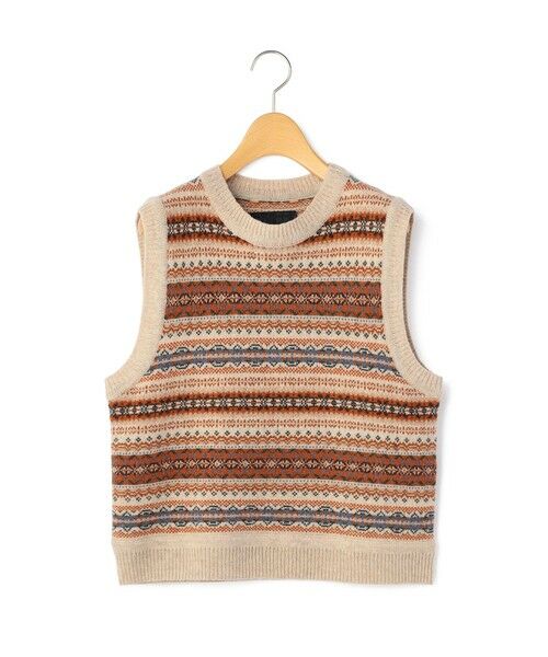 毛混合であたたかな肌触りのニットベスト。幾何学模様が段になった華やかなフェアアイル柄が目を惹くデザイン。裾のリブがメリハリあるシルエット。お手持ちのアイテムと重ね着するだけでおしゃれな着こなしが完成。シャツに合わせればシックなムードに。お出かけからオフィスカジュアルまで幅広く活躍するアイテムです。※商品画像はサンプルを使用しているため、実際の商品と色味などの仕様が異なる場合がございます。予めご了承ください。model:T.172/B.83/W.59/H.87着用サイズ:38