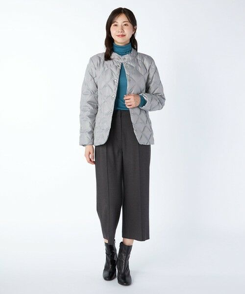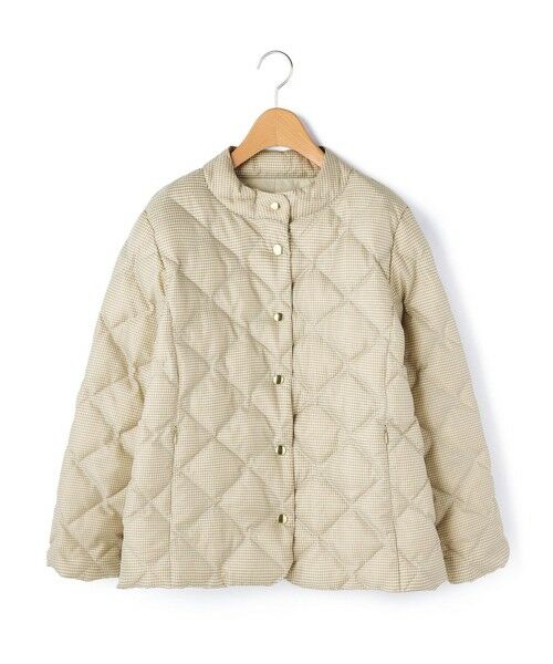 ギンガムチェック柄が華やかなデザインのダウンコート。ダイヤ柄ダウンがエレガントなムード。着こなしやすくすっきりとした印象のストレートフィットのシルエット。スタンドカラーの衿とフロントのシルバーマットのスナップボタンがスタイリッシュなアクセント。便利なジップポケット付きでデイリーに活躍するアイテムです。※商品画像はサンプルを使用しているため、実際の商品と色味などの仕様が異なる場合がございます。予めご了承ください。model:T.172/B.83/W.59/H.87着用サイズ:38