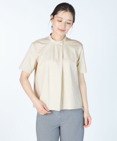 コットンをベースにポリエステルを織り交ぜた天竺素材のプルオーバー。アシンメトリックなバンドカラーを採用し、モードな感性を潜ませた1点です。首元にタックを施すことで、裾に綺麗なドレープが生まれるデザイン。仄かな光沢のある素材感で、着こなしを上品に映し出すアイテムです。パンツともスカートとも好相性。