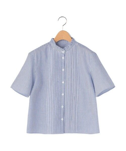 細めのストライプ柄がさわやかなムードの半袖ブラウス。フリルのスタンドカラーが愛らしいデザインポイント。涼やかなパナマ織りのコットン素材で心地よい肌触りの生地感も魅力。ストレートカットの裾で様々なボトムとマッチ。春夏シーズンらしいおしゃれなお出かけコーディネートが実現するアイテムです。紡績:(たて糸)インドネシア (よこ糸)スイス(アイスコットン使用)染色:日本製繊:日本縫製:ベトナム