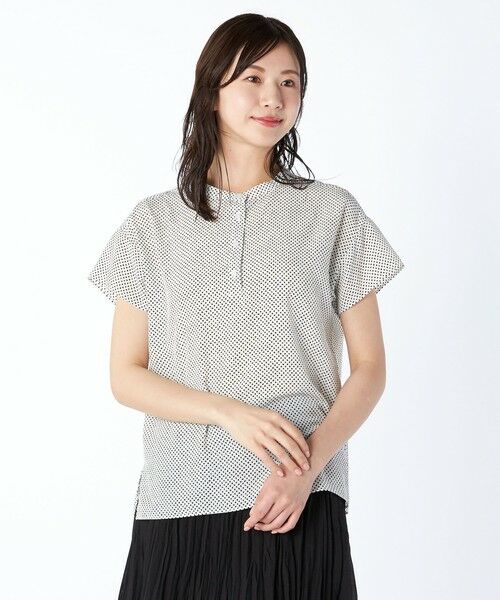 ペブル柄プリントが華やかな半袖ブラウス。手書きのような有機的なラインの柄が印象的なデザイン。スタンドカラー、サイドスリットなどトレンド感のあるフォルム。背中にはタック入りでふんわりとしたシルエットがフェミニンなポイント。スタイリッシュなお出かけコーディネートにぴったりな一枚です。※商品画像はサンプルを使用しているため、実際の商品と色味などの仕様が異なる場合がございます。予めご了承ください。model:T.172/B.83/W.59/H.87着用サイズ:38