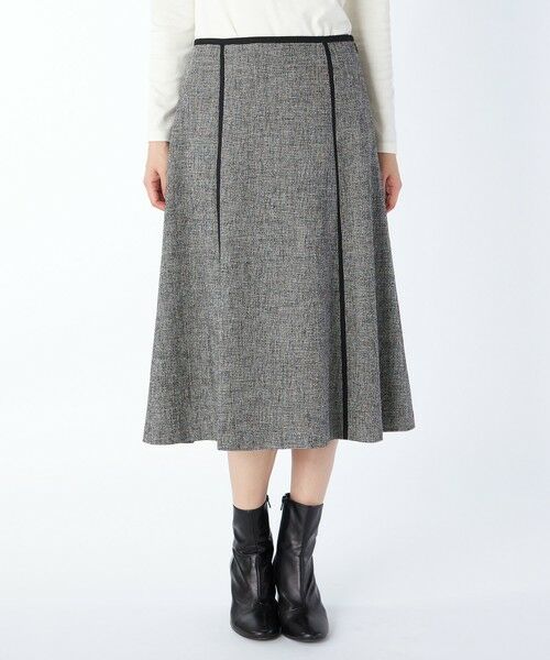 クラシカルで華やかなラメツイード生地を用いたスカート。膝下丈のフレアシルエットもエレガントな雰囲気です。切替部分に配色パイピングをあしらうことで、モダンなムードも漂うデザインに。スタイリング次第でオンオフ兼用で幅広いシーンに活躍し、同生地のベストを合わせるとセットアップスタイルも楽しめます。※商品画像はサンプルを使用しているため、実際の商品と色味などの仕様が異なる場合がございます。予めご了承ください。model:T.172/B.83/W.59/H.87着用サイズ:38