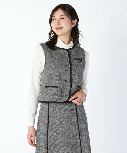煌めくラメ糸を織り交ぜたツイード生地のベスト。配色パイピングやくるみボタンがアクセント。コンパクトなシルエットながら、袖ぐりを広めにしているため様々なトップスに合わせられます。フォーマルに着こなすのはもちろん、日常のカジュアルスタイルに取り入れるのもおすすめ。同生地のスカートと上下セットでも着用可能です。