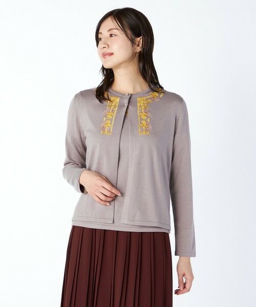 首元の刺繍がお顔まわりを華やかに彩るハイゲージニットカーディガン。シンプルなクルーネックタイプで、すっきり着こなせるコンパクトなシルエットです。フロントは上部のみにボタンを設置した軽やかなデザイン。シャツやワンピースなどの羽織りとして幅広く活躍します。同生地のニットとアンサンブルでも着用可能です。