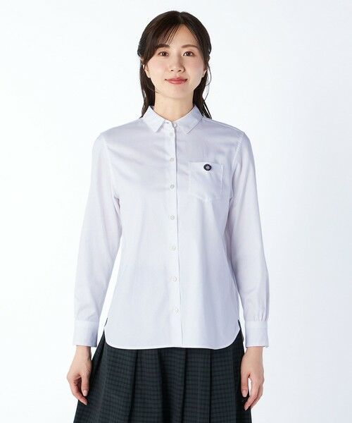 バックヨーク下のギャザーが立体感のあるシンプルなデザインのブラウス。サイドの裾にはチェック柄のガジェットがあしらわれた細部までおしゃれなデザインの一枚。すっきりと着こなせるストレートカットの裾がスタイリッシュ。シンプルなデザインでスタイルを問わず着こなせて、ビジネスシーンから休日のお出かけまで様々なシーンの着こなしで活躍します。