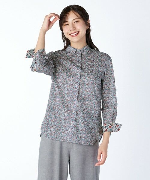 リバティプリント柄が華やかなデザインの長袖ブラウス。細かなフラワープリントが目を惹く一枚。カフス裏地と剣ボロ部分には異なるデザイン柄生地をあしらい、袖先を折り返すとより華やかなスタイリングに。お手持ちのボトムに合わせるだけで、スタイリッシュなお出かけコーディネートが完成するアイテムです。※商品画像はサンプルを使用しているため、実際の商品と色味などの仕様が異なる場合がございます。予めご了承ください。model:T.172/B.83/W.59/H.87着用サイズ:38