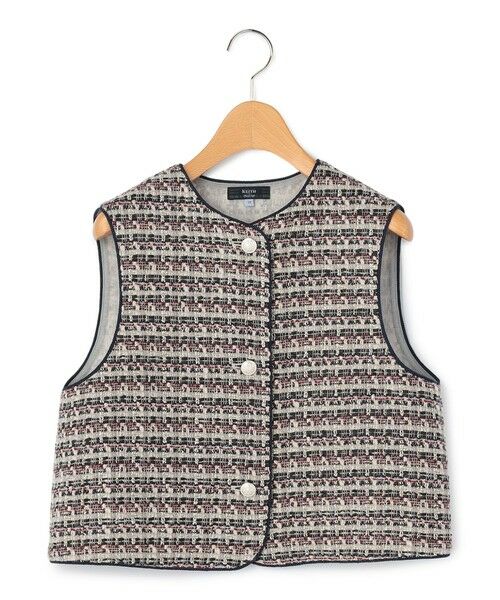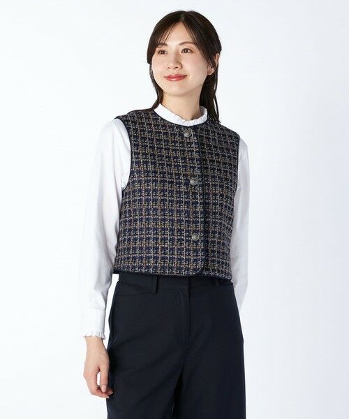 表情豊かで華やかな雰囲気もある生地のベスト。ブレードのパイピングが印象を引き締めるアクセントとして効いています。メタリックなボタンにはクラシカルな紋章風のモチーフをデザインするなど、細部にまでこだわりが十分。短めの着丈ですっきりと着こなせ、さまざまなコーディネートにプラスできる1枚です。※商品画像はサンプルを使用しているため、実際の商品と色味などの仕様が異なる場合がございます。予めご了承ください。model:T.172/B.83/W.59/H.87着用サイズ:38