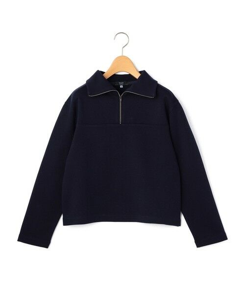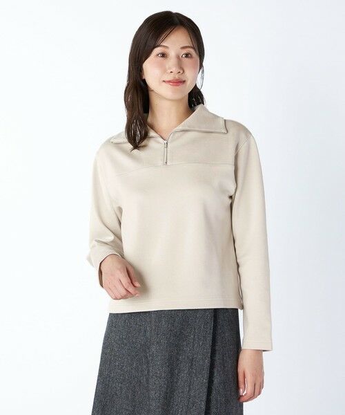 伸縮性に優れ、快適な着心地のポンチ素材で仕立てたプルオーバーカットソー。フロントはハーフジップ仕様で、ハイネックも楽しめる便利なアイテム。トレンドに左右されないシンプルなデザインで、長く愛用出来る一枚。※商品画像はサンプルを使用しているため、実際の商品と色味などの仕様が異なる場合がございます。予めご了承ください。model:T.172/B.83/W.59/H.87着用サイズ:38
