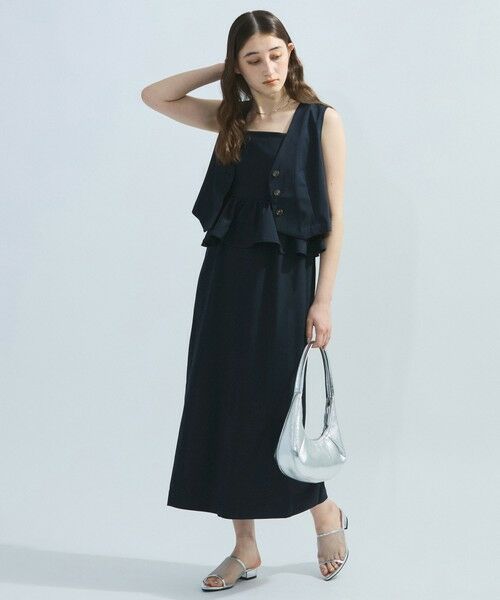 ワンピースはペプラムラインのビスチェとIラインスカートをコーディネートしたようなデザインになっており、旬なコーディネートが完成します。