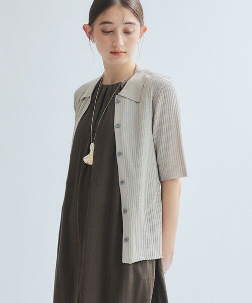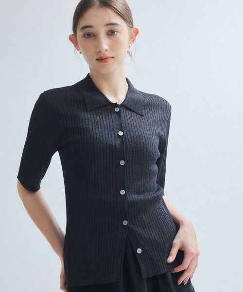 レーヨン・ナイロン素材のシャ感のある糸をリブで編みたてた前開きデザインのポロトップスです。