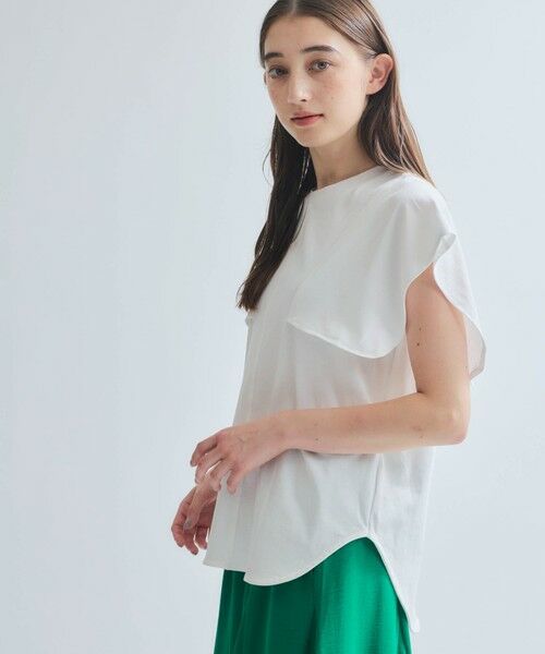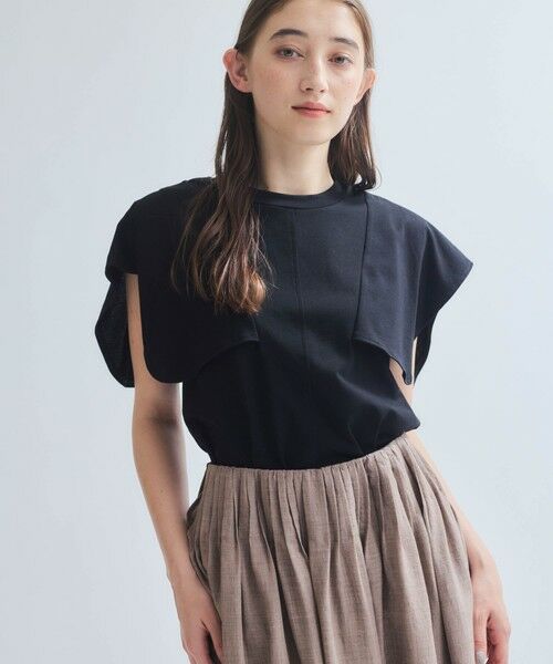 ハンカチーフのようなデザインを袖口に取り入れたフレアスリーブのTブラウスは、二の腕を覆いながら、軽やかに揺れるフレア感が涼し気な一枚です。