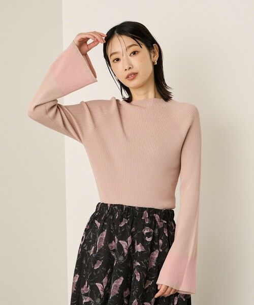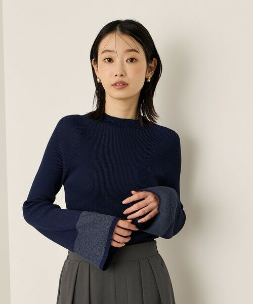 レーヨンナイロンの糸を使用したほのかにフレアラインを描き、配色見えになったスリーブデザインが特徴のリブニットです。