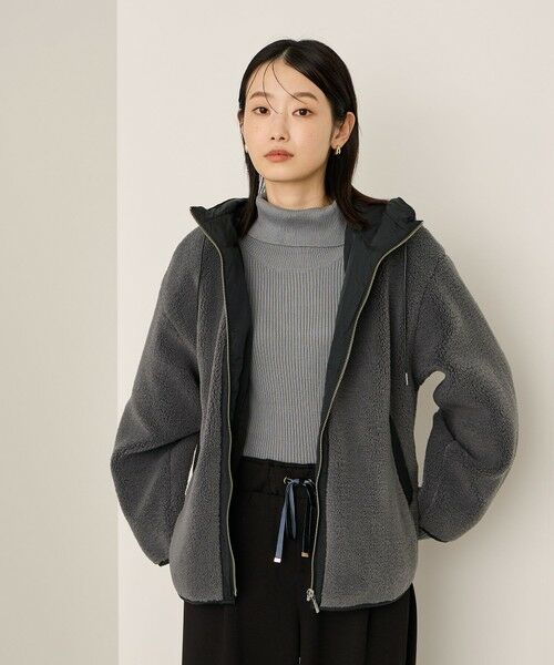 密度の高い肉感のあるボア素材を使用し、微光沢感のあるテキスタイルで切り替えたフーディブルゾンです。