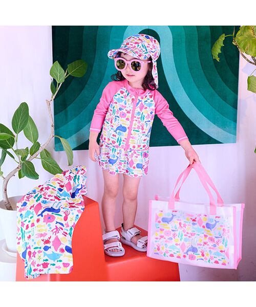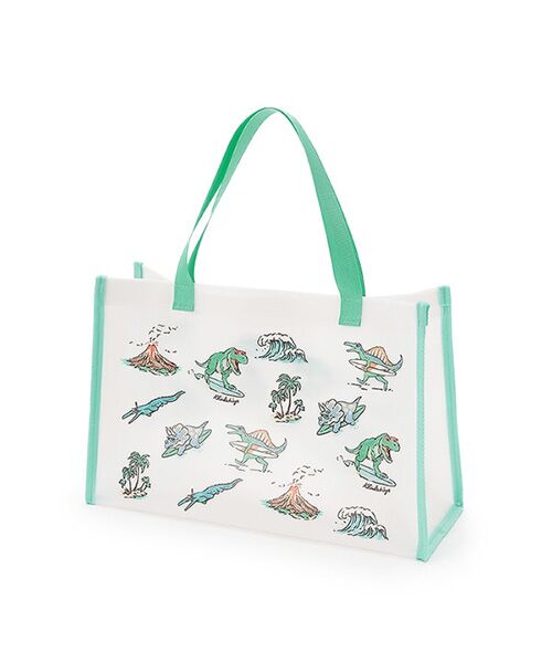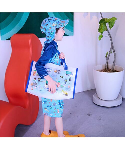 プールや海などのレジャーシーンに活躍するバッグです。水着と同じ3種類の柄のバリエーションから自分好みに選べます。ピンクはお魚柄、エメラルドグリーンは恐竜柄、紺は乗り物柄をデザイン。正面、背面共にプリントを入れているため、中身が透けにくくなっています。