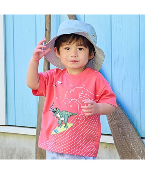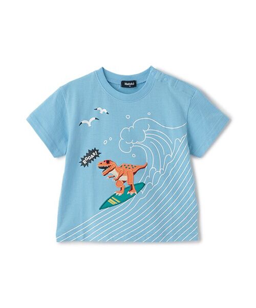 サーフィンをする恐竜のアップリケが個性的なTシャツです。
