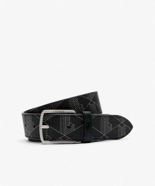 上質感漂うエレガントな素材にモノグラム柄を配したスタイリッシュなレザーベルト・グレインレザーの豊かなシボ感を表現した素材にコントラストカラーでモノグラム柄を配置・ベルトループにボディと同色のワニロゴプレートを配置・シャープな印象を与えるメタルバックルにはブランドネームロゴを刻印