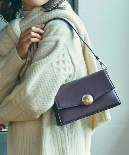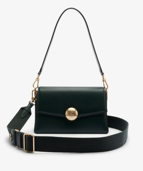 高級感漂う型押しレザーの風合いとかっちりとしたフラップデザインがエレガントな存在感を放つショルダーバッグ。テニスボールをモチーフにしたゴールドメタルバックルが、クラシックなシルエットにモダンリュクスなフィーリングを添えます。