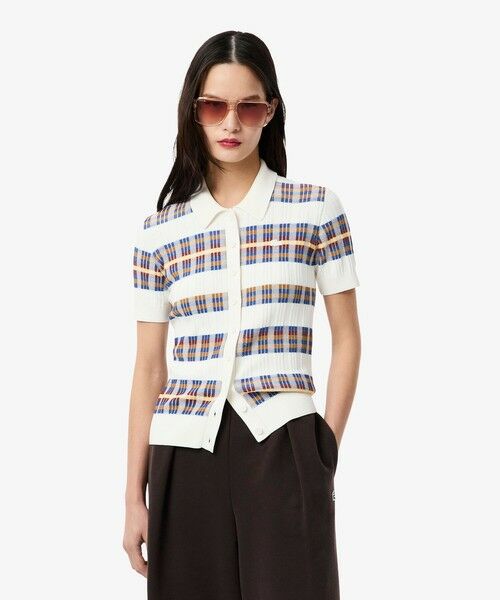 立体的に編まれたリブニットに躍動感を宿したマルチカラーニットボタンシャツ・レスポンシブルビスコース×ポリエステルのリブニット素材・立体感のある編地にマルチカラーボーダーをジャカードで表現・ブランド伝統のポロシャツディテールを踏襲したリブニットカラー・左胸に同色のワニロゴパッチを配置