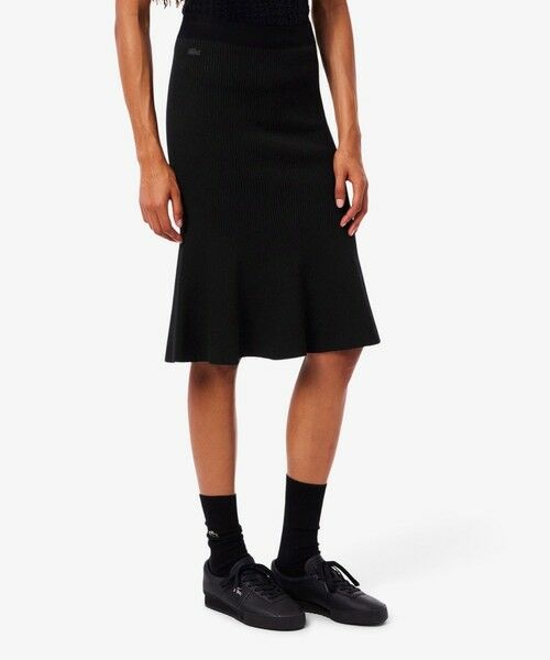 シームレスな美しさと快適性を両立した3Dリブニットフレアスカート・レーヨン×ポリエステルのストレッチ糸を使用した3Dリブニット素材・縫い目を抑えた立体構造でストレスフリーな着心地・女性らしいフレアシルエットのミディ丈デザイン・ウエストに同色のワニロゴパッチを配置
